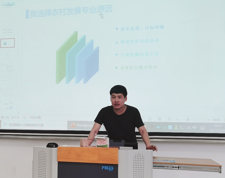 在读研究生法学专业丛毅竹、农推专业梁英杰,分别根据自身实际情况为大家提供相关经验分享和具体交流。从专业、英语、政治三方面分析。专业科目上,严格依据各高校考试大纲;英语科目方面,重在练习,多动脑,勤动手;政治科目方面,重视考试大纲,注意答题条理。此外,丛毅竹告诫同学们近年来考研队伍规模逐年扩大,报录比逐年增高,升学难度加大。第一志愿选择方面要综合自身情况综合分析、理性选择,着重强调了“不攀比看自己、多做题不怀疑”的考研心态,选择适配自身的高校和专业。