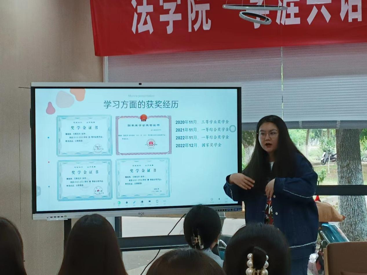 本次活动中,8位优秀学子结合自身校园学习、生活和实践经历,就专业学习、员工工作、职业规划、心灵寄语等为大家进行分享。即将赴墨尔本大学继续深造的卢紫嫣介绍了律所实习经验、法学专业国外留学规划等;保研至华东政法大学的王一禾就大学期间的员工工作、专业竞赛等为大家进行分享;保研至中央财经大学的龙腾结合自身入伍经历、学习经验等内容鼓励大家珍惜学习时间,做好大学规划;现处于江苏省2023年度考试录用公务员考察阶段的詹志杰重点介绍了法学专业的就业方向并寄语大家:扩宽渠道了解信息,做适合自己的学涯规划。社工专业的优秀学子分别就保研、考研、就业三个方向进行总结,从目标设定、系统规划、实施策略、注意事项等多个维度分析了本科阶段,认为大一、大二需要制定符合个人能力和发展需要的目标计划,树立信心;到大三、大四要具体定位以及开展准备,学会从心理、生理与方法不同角度来调适自我,加强自我管理,贵在坚持。在自由提问环节,同学们从各个角度提出困惑,每位分享者都细心解答,为本科生规划大学阶段的学业和生活提供宝贵的建议。