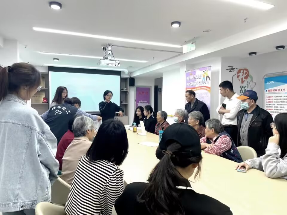 接下来,师生来到丽新社区党群服务中心,社区书记介绍丽新社区基本情况以及“倷伲金乡邻”居民自治品牌建设情况。员工们近距离学习了丽新社区较为成熟、完善的居民自治品牌建设过程,切身体会到基层治理趋于丰富与多元化。介绍结束后,员工们踊跃发言,围绕社区养老、就业方面的问题提出对基层社区治理的认识和疑问,社区工作人员也进行耐心解答。在现场融洽和谐的交流氛围中,团队成员了解到更多关于社区治理和认知障碍防治项目相关知识,收获颇丰,也有效促进了专业知识与社会实践的发展。