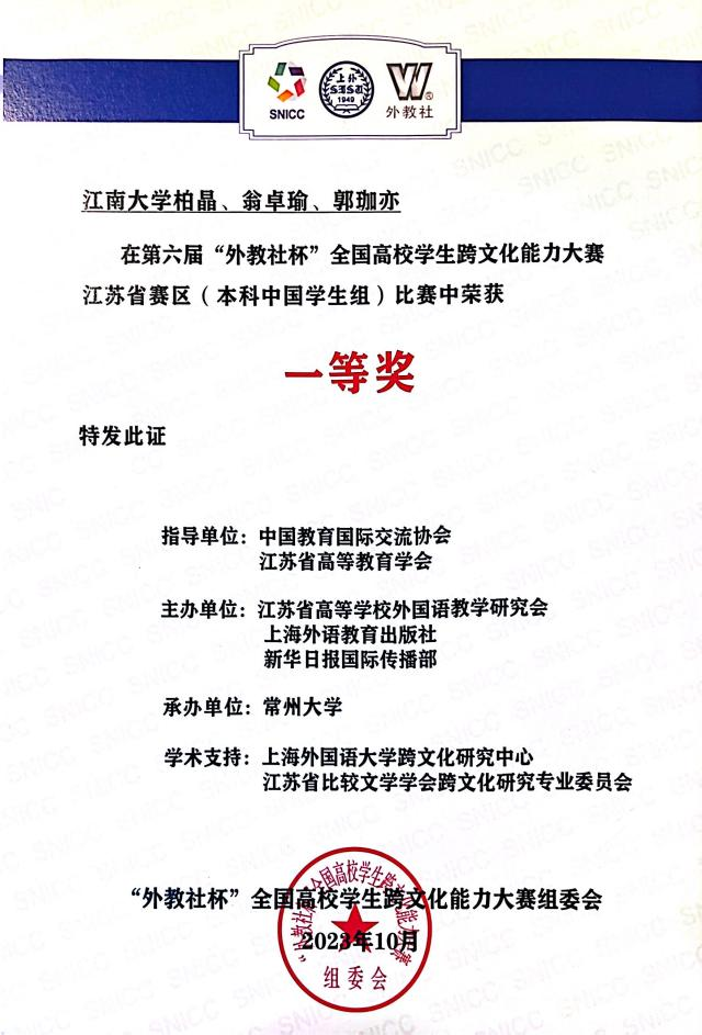10月28日至29日,第六届“外教社杯”全国高校员工跨文化能力大赛江苏省赛区比赛在常州大学开展。经公司选赛,PlayAce社工2202班翁卓瑜、郭珈亦与外国语公司英语2101班柏晶代表公司参赛并获得江苏省赛区(本科中国员工组)比赛一等奖。