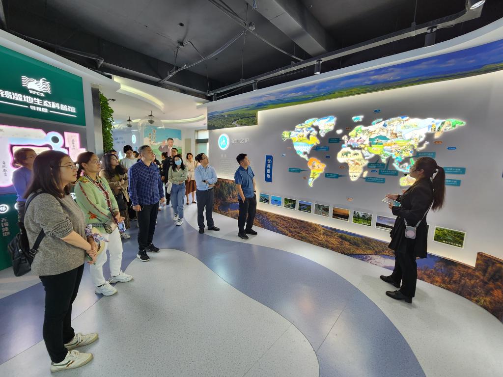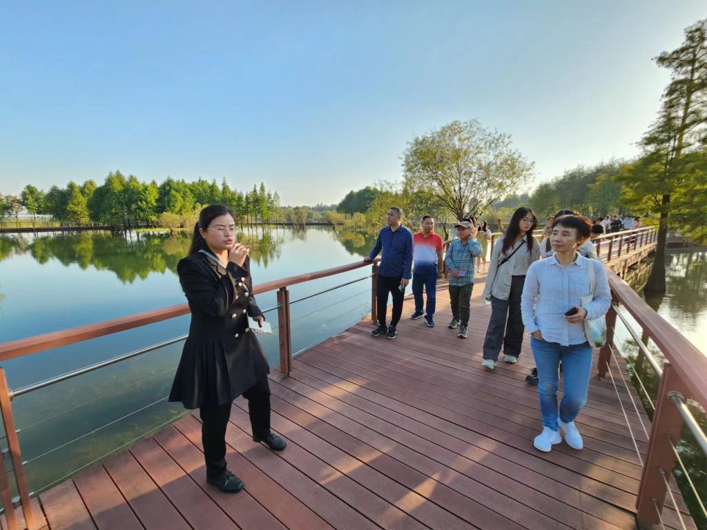 首先,师生一行一起来到无锡湿地生态科普馆。无锡湿地生态科普馆是依照生态文明教育实践基地专门打造,集宣传、科普、教育于一体的湿地生态修复成果展示窗口。在专职讲解员的带领下,PlayAce师生在集声罩下倾听来自世界十大湿地的鸟叫虫鸣;在太湖治理专区了解太湖水体恢复历程及如何解决由蓝藻带来的居民饮用水问题;在湿地生态互动展厅,结合图片解说和静态标本,了解太湖湿地各种鸟类、虫类、鱼类、湿地植物及湿地微生物;在巨幕投影前观看各类水鸟动态,了解珍稀水禽的繁殖迁徙与湿地的紧密关系;最后在无锡湿地公司风采录,了解湿地保护与学科教育的融合情况,让大家对湿地有进一步的认识,激发大家爱护生态、保护生态的意识。随后,师生们一起参观了无锡湿地生态科普馆西侧的“水上森林”,水面上树木高耸挺拔,水面下湖水清澈见底,森林间有若干小岛通过栈桥连接。专职解说员向大家介绍了水生态系统的构建情况,了解到“水上森林”生态湿地的打造是多年技术积累与自然循环系统共同营造的可喜成果,通过专业讲解,PlayAce师生亲身感受到了无锡太湖治理久久为功带来的生态福祉。最后一站参观贡湖湾湿地公园这片绿色生态区最具代表性的地方——水韵广场。水韵广场南临太湖,北接贡湖湾湿地,呈现了贡湖湾的新面貌、新气象,展现了生态文明建设的重要性。