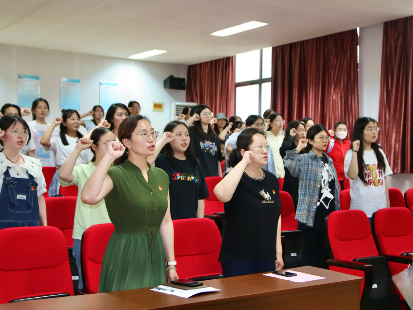 活动第二项议程,党员整齐站立,共唱国际歌。国际歌对于新入党的党员来说,是一次心灵的洗礼,也是他们政治生活中的一个重要转折点。此环节勉励新党员将国际歌的精神内化为自己的行动准则,以更加严格的标准要求自己,不仅在思想上与党保持高度一致,而且在行动上积极践行党的纪律和国家的法律,在党的领导下,勇往直前,为实现共产主义的伟大理想而不断努力。活动第三项,新党员们整齐地站立,面向鲜红的党旗,神情严肃坚定进行入党宣誓。