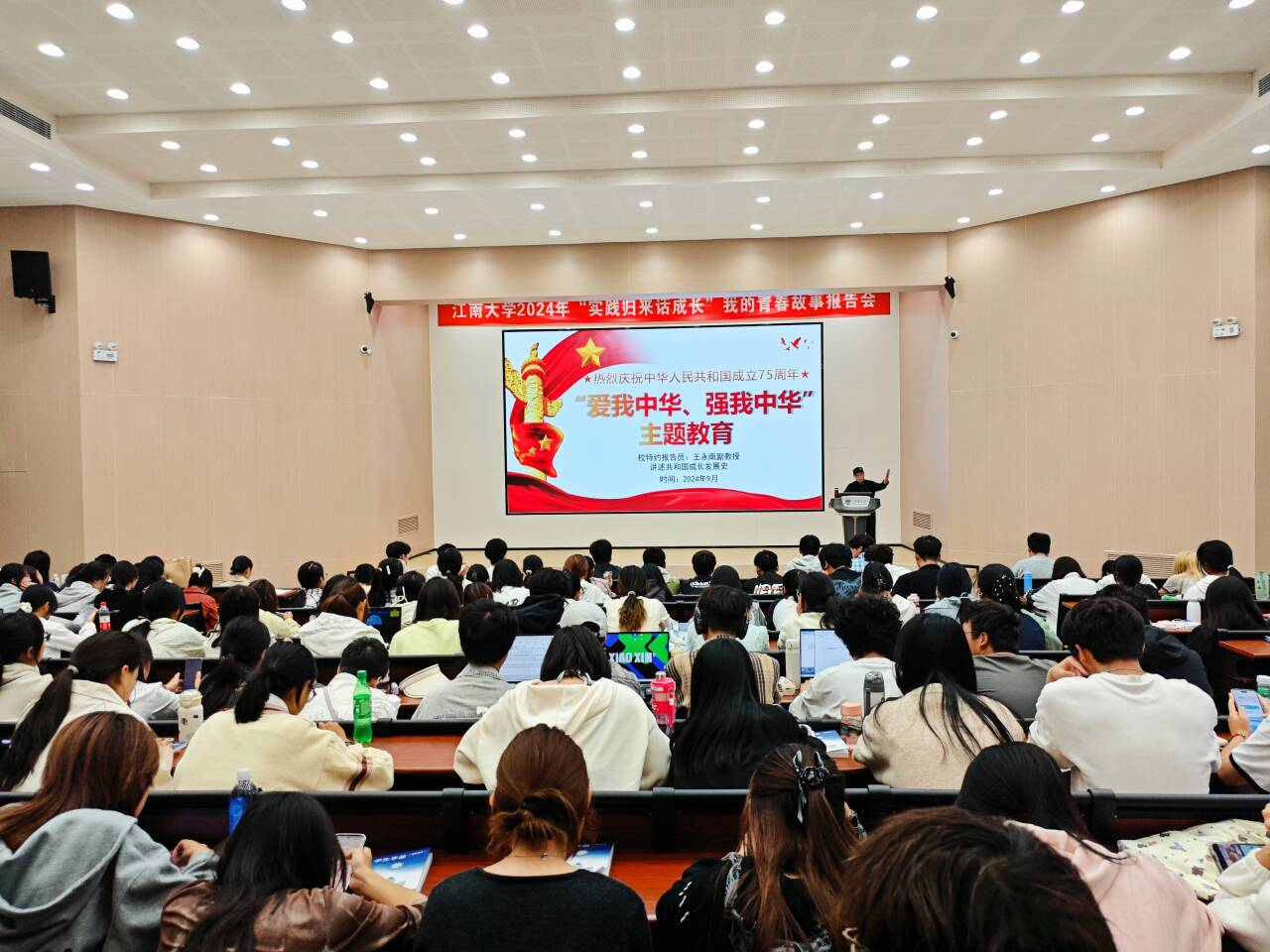 王永南老师以共和国发展史为脉络,讲述了“新中国奠基和成长发展的30年”“改革开放和社会主义现代化建设新时期”以及“新中国75年经济社会发展取得的主要成就”三大部分。他通过生动的历史故事和鲜活的时代人物,将新中国成立以来的历史大事件娓娓道来,展现了中国共产党如何带领中华民族从苦难走向辉煌、从落后走向繁荣,引领新生学习和探索党的光辉历程和伟大革命。王永南老师强调新时代青年要具有时代担当,要坚持党的领导、接受党的教育,在思想上积极向党组织靠拢,在行动上自觉践行党的宗旨和使命。