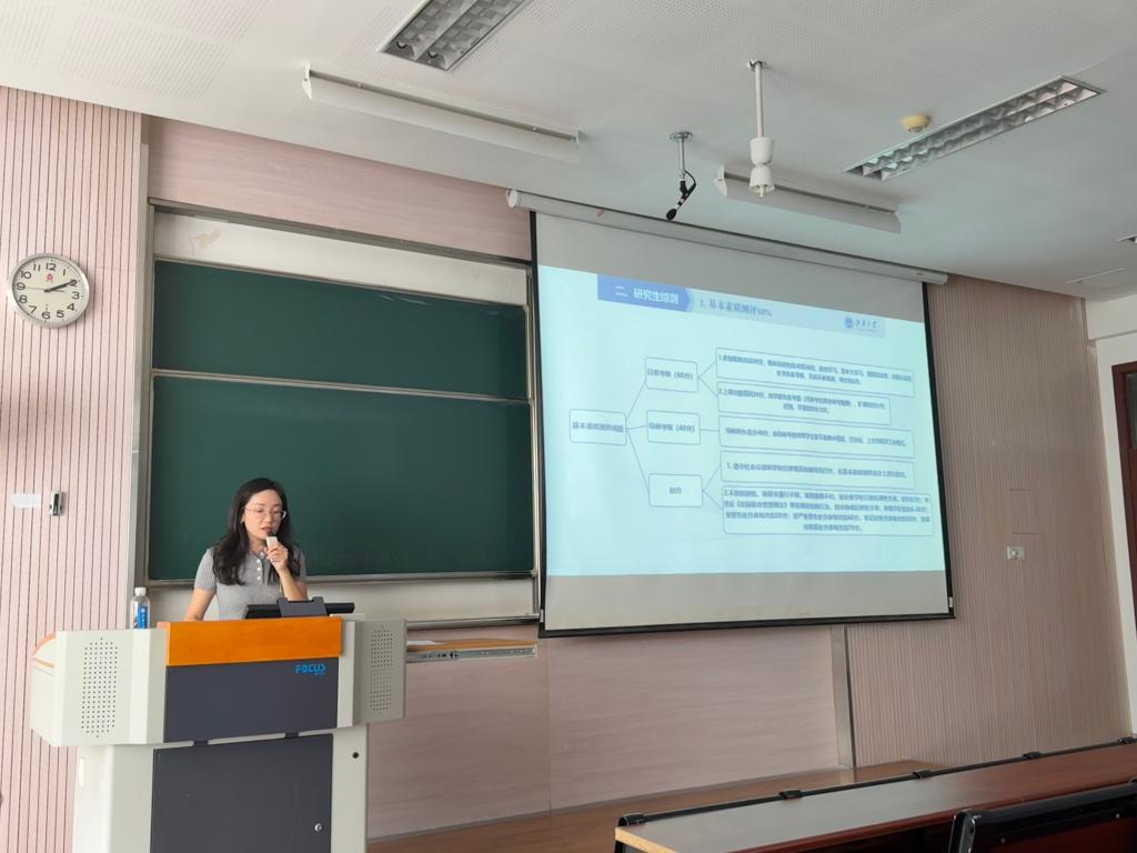 会议围绕“奖、助、竞、安、科”五大核心模块展开系统解读。徐雅静老师首先从研究生奖助体系切入,详细阐释了各类奖助学金的评选标准、资助比例及发放机制,并结合综合素质测评体系,对基本素质、专业素质、实践素质三大测评维度进行深度解析。她特别强调,参与学科竞赛、科研项目申报及学术论坛是提升科研素养的关键路径,鼓励新生积极参与普法实践、学术文化节等特色活动,在依法治国、服务乡村振兴、基层治理等国家战略中锤炼专业能力。
