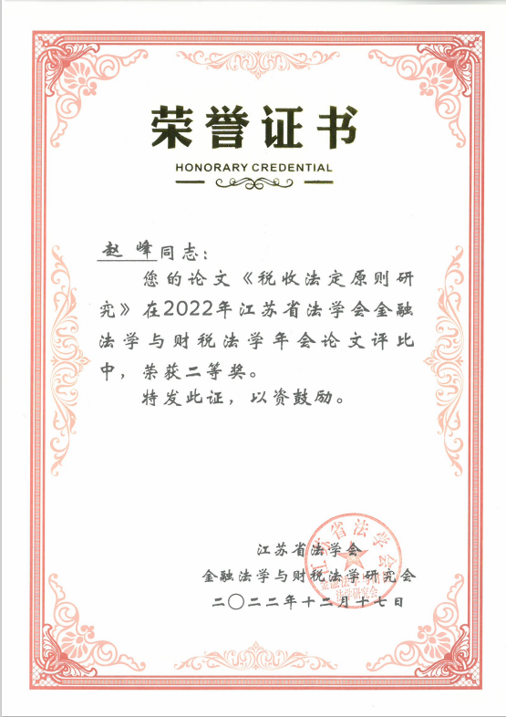12月17日,公司赵峰老师参加2022年江苏省法学会金融法学和财税法学年会,作《税收法定原则研究》的主题报告,并荣获二等奖。