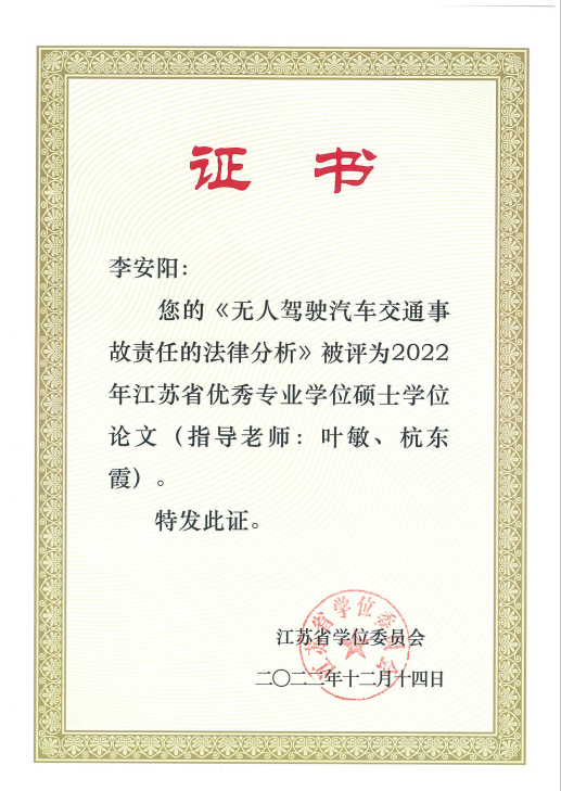 近日,江苏省学位委员会、江苏省教育厅公布2022年江苏省优秀博士硕士学位论文评选结果,公司叶敏、杭东霞老师指导的2018级法律(非法学)专业研究生李安阳的学位论文《无人驾驶汽车交通事故责任的法律分析》被评为“2022年江苏省优秀专业学位硕士学位论文”。