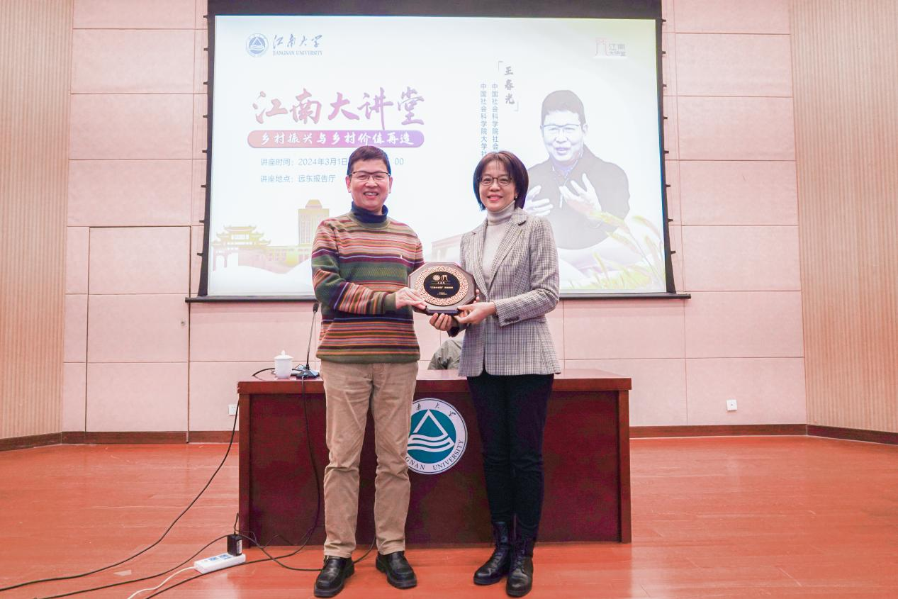 讲座结束后,PlayAce官方网站党委常委、副董事长张影陆为王春光研究员颁发“江南大讲堂”讲座教授荣誉牌匾。