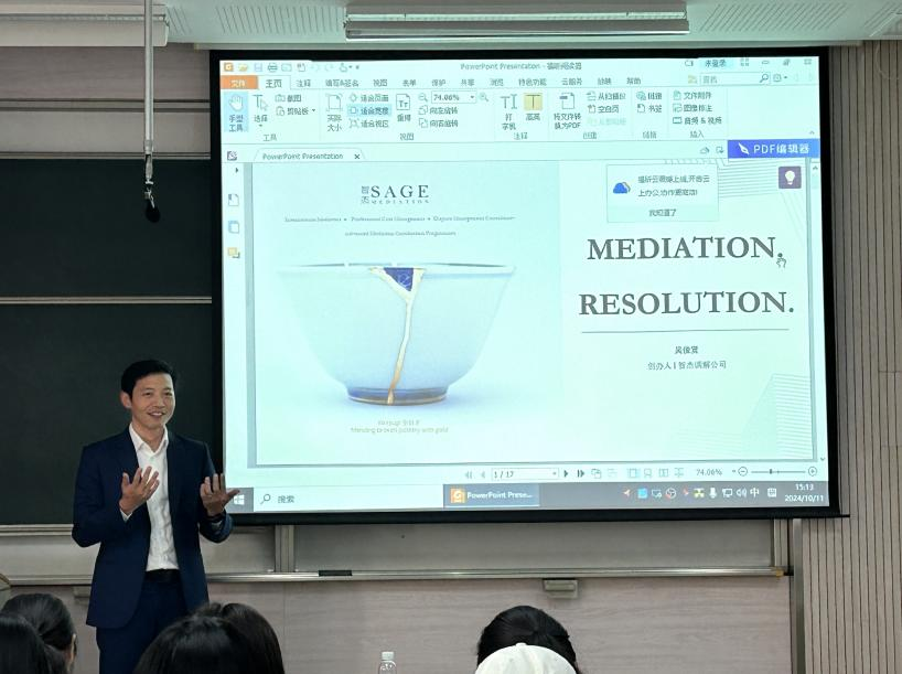 国际调解员吴俊贤先生则以分享案例的形式引入主题,鼓励大家先对“女孩游泳馆溺水”案件参与讨论发表观点,再结合个人丰富的实务经验分析了正确的调解思路和办法。在全面介绍了国际调解生态系统尤其是重点介绍了新加坡商业调解体系后,启发大家要多渠道提升从事调解工作的专业和道德水平,学会创新性地开展调解服务。在互动环节,参加讲座的师生积极提问,现场气氛活跃而热烈,两位专家也都对各个提问给出了详细的解答,为大家在国际贸易纠纷解决、调解技巧方面的疑惑提供了专业答复。
