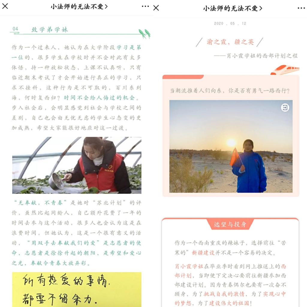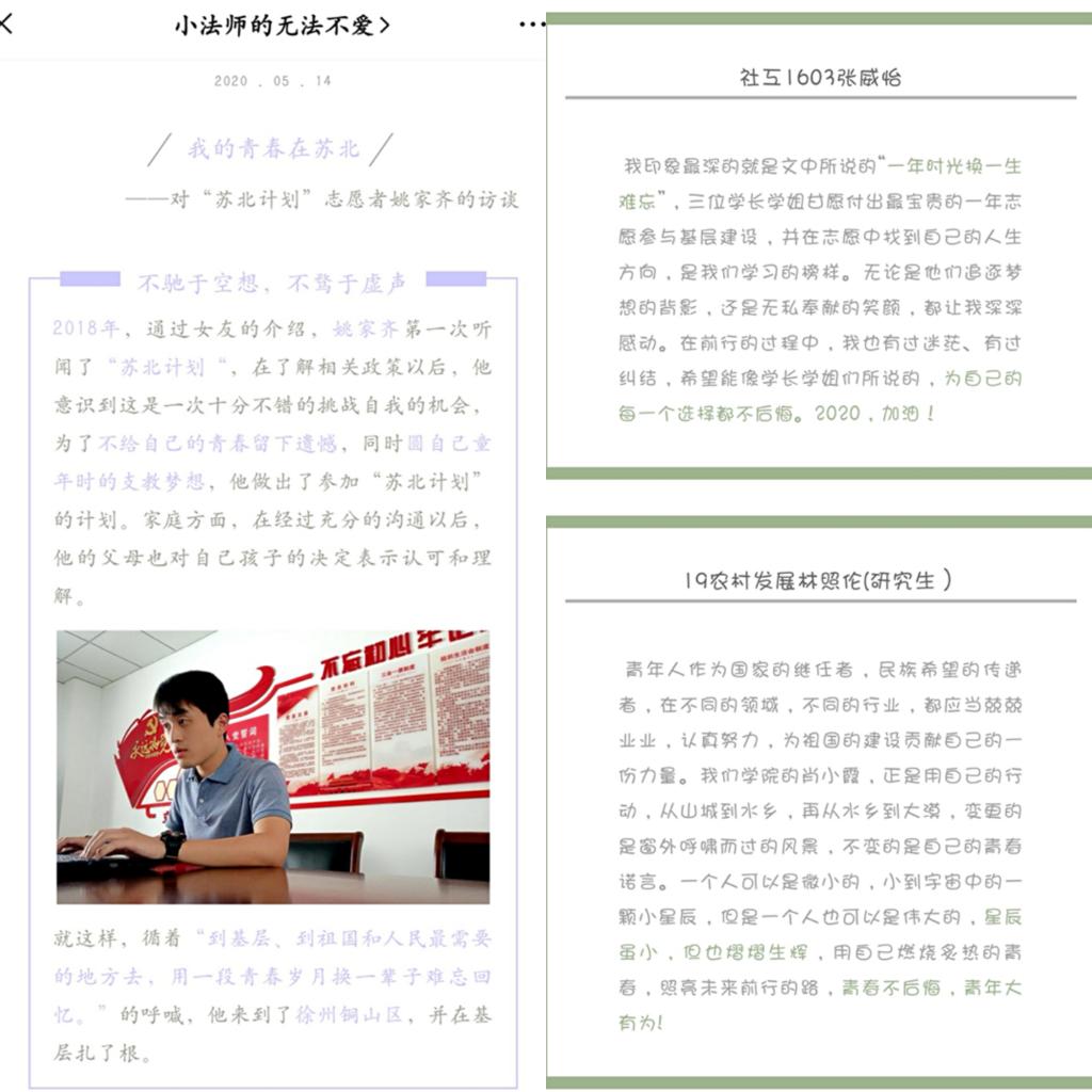 此次活动采用线上“典型事迹分享”+“在校学子感悟”双向呼应的方式,将优秀学子基层就业的榜样力量推到老员工身边,形成老员工到基层建功立业的积极导向,激发毕业生志愿服务西部、深耕基层的热情,培育法学学子,勇敢担当时代使命,不畏艰险砥砺前行的精神品质,活动同时启动2020届西部计划、苏北计划毕业生志愿者的报名工作。