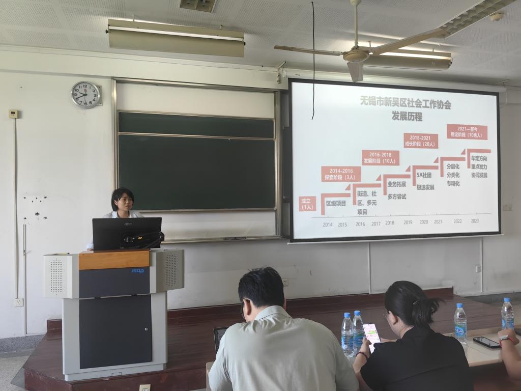 接下来进行校地实习双选会由孙圣老师主持,无锡市新吴区社会工作协会彭老师、无锡市人民医院金老师、南京天一智慧养老服务有限公司林老师、无锡市惠山区四叶草儿童青少年成长中心杨老师、无锡市明康社会工作服务中心贡老师、无锡向日葵公益服务中心郑老师、无锡市梁溪区清越社会工作服务中心梁老师等单位代表依次进行介绍,并对单位情况、实习内容、实习福利、招募要求等方面进行说明。最后,2021级社会工作专业员工与实习单位代表进行自由交流,初步确定实习意愿。